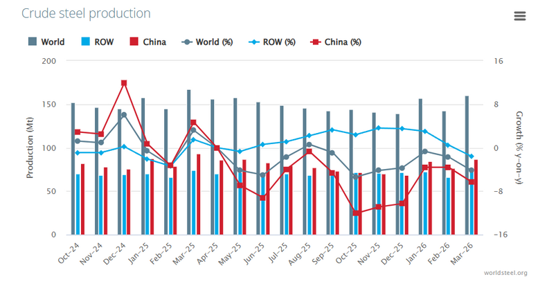 Global crude steel production fell in March 2026, reflecting ongoing pressure on the sector, although developments varied significantly across regions.