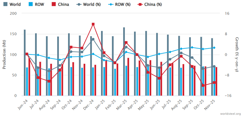 obal crude steel production declined again in November, reflecting continued weakness in key markets. According to data released by the World Steel Association (worldsteel), the 70 reporting countries produced 140.1 million tonnes of crude steel in November 2025, down 4.6% compared with the same month last year.