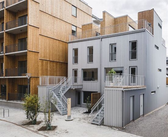 "Lilla Integralen" is an elegant semi-detached house with four residential units on three floors and a roof terrace. It is located in the new development area Vallastaden of the Swedish town of Linköping. In the first construction phase of the residential quarter Vallastaden, 1,000 apartments were built, which were planned by 40 different architects.