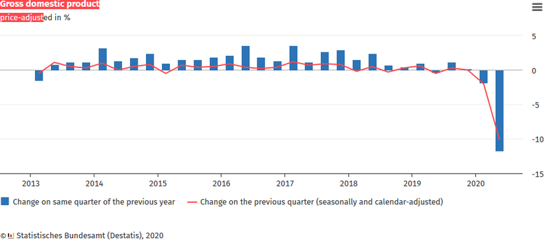 The gross domestic product (GDP) fell a price-, seasonally and calendar-adjusted 10.1% on the first quarter of 2020. This was the largest decline since the beginning of quarterly GDP calculations for Germany in 1970. It was much larger than during the financial market and economic crisis (-4.7% in first quarter of 2009). The Federal Statistical Office (Destatis) also reports that in the second quarter of 2020 a massive slump was recorded for exports and imports of goods and services as well as for household final consumption expenditure and capital formation in machinery and equipment. General government, however, raised its final consumption expenditure during the crisis.