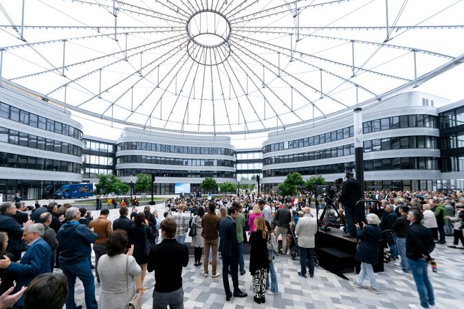 Following a construction period lasting around four years, SMS group has opened its new Campus in Mönchengladbach-Dahl, which offers around 1,500 innovative workplaces on an area covering 44,000 square meters. The Campus architecture is characterized by five building sections arranged in a circle and grouped around a central plaza. This plaza is spanned by a transparent membrane roof with a unique design, featuring a cable support structure, an outer pressure ring, and 40 air cushions, which together weigh about 300 tons. The roof, custom-made for the Campus, represents an innovation in the commercial sector and fosters an atmosphere of open interaction.