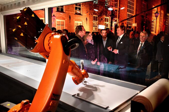 In Dordrecht, the Netherlands, a KUKA KR 16 robot, now part of the KR CYBERTECH series, is part of an art project on the occasion of the 400th anniversary of the Dordrecht Synod. In the work of the artist group robotlab from Karlsruhe, the KUKA robot independently writes down the Bible in Dutch with a calligraphy pen. The process was solemnly launched by the Dutch King. Overall, the description of the five rolls, each with a length of around 200 meters, takes nine months.