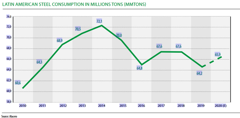 The performance of steel consumption in Latin America in 2019 registered a 5% decrease, totalling 64 million tons. This result is a serious symptom of worsening deindustrialization process, which has been present for decades and can impact the stability of 260,000 direct jobs in the sector. The lower steel consumption in the region reflects a significant economic contraction of Latin American countries, particularly of the three main economies: Mexico, Argentina and Brazil, which account for 87% of the reduction. Among the main reasons for this situation are the global economic slowdown, lower commodities prices, US trade disputes with its partners, the decrease of world trade and political uncertainties and their effects on investment facing these countries and their neighbours in Latin America. Comparing the consumption trend in previous years, a gradual fall is seen from 2014, when consumption reached its highest level (72.1 Mt). This fall represents a setback compared to the initial estimate of almost 5 million tons. “We note with concern that a result of this type makes the situation - reflected in Alacero studies' - worse in what refers to the deindustrialization process we have been suffering. And we are just in time to update this study for all of Latin America” Francisco Leal, director of Alacero, comments. According to Professor Germano Mendes de Paula - Alacero studies' coordinator, professor of economics at the Federal University of Uberlândia (Minas Gerais, Brazil) and an expert in the steel industry, "unemployment is an effect of the gradual process that has entered our region since the middle of the century's first decade, which we call deindustrialization", he says. According to Mendes de Paula, the industry explained 30% of Latin America's GDP in 2000, but currently it only corresponds to 15%.“Steel consumption reflects industrial dynamism. All industries consume steel: construction, automotive, machinery and equipment, packaging, agriculture etc. The fall or low growth in steel consumption is more severe in emerging countries, as there, since they still need to import more capital goods than industrialized countries". In 2020 the initial expectation in Latin America is a 2.8% growth in steel consumption, which is expected to reach 66 million tons. The projection is influenced by Brazil, the main economy of the region, which has a favourable outlook for this year, due to the economic reforms that have been implemented. This estimate may change depending on the economic effects from the coronavirus, which has caused financial and economic volatility; that in turn has resulted in downward revisions of the economic forecasts available at the beginning of 2020.