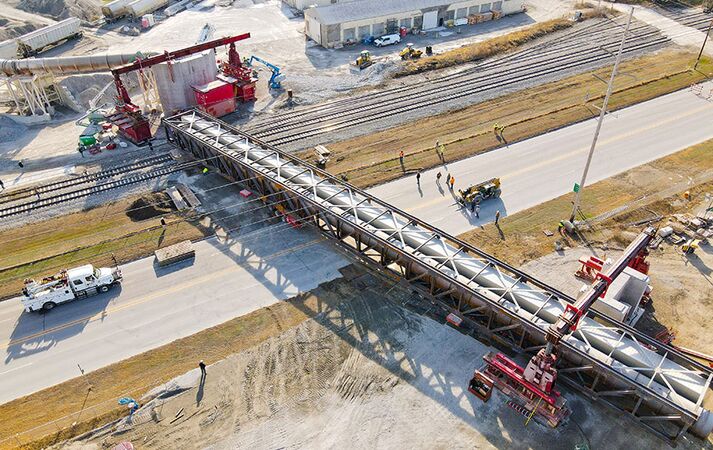 Mammoet has successfully transported, lifted and set a new pipe rack for Linwood Mining and Minerals Corp in Davenport, Iowa. Due to increased demand for their calcium and lime products, mining was extended to an underground operation and the company introduced new equipment and technology to accommodate mine expansion and meet customer needs. The newly installed pipe rack provides additional ventilation for the kilns, and the shed will support a future conveyor belt in order to improve efficiency.