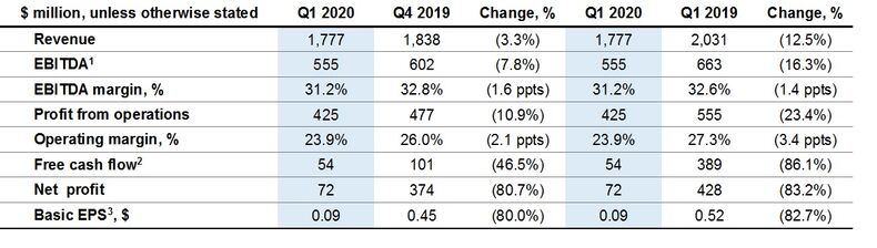 - Group EBITDA was 16.3% lower y/y at $555 million (Q1 2019: $663 million), primarily reflecting lower revenues partially offset by a reduction in cost of sales. The Group’s EBITDA margin remained high at 31.2% (Q1 2019: 32.6%).