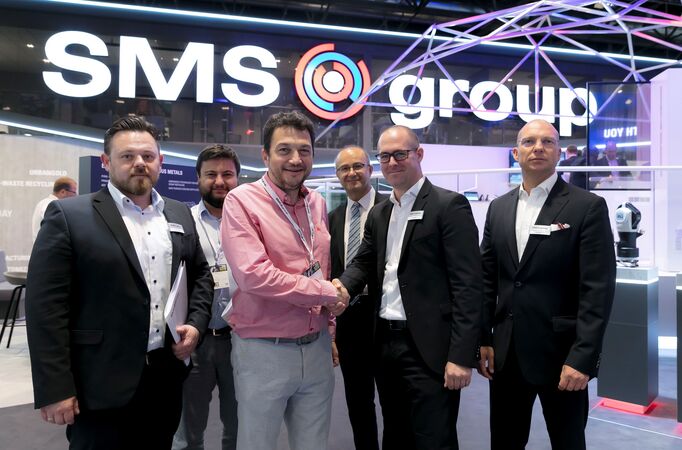 Photo: Hasçelik visiting the SMS group stand at METEC 2019. In the front, from left to right: Viktor Härter, SMS group; Naci Faydasiçok, Hasçelik; Falk Rößeler, SMS group; Michael Süs.