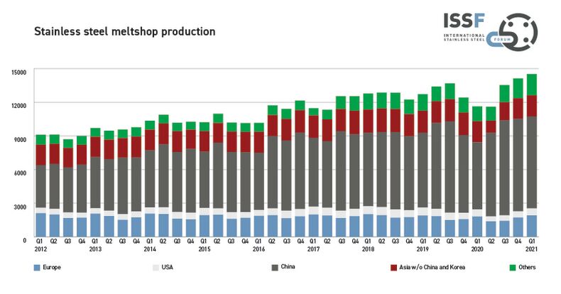 The International Stainless Steel Forum (ISSF) has released figures for the first three months of 2021 showing that stainless steel melt shop production increased by 24.7% year–on–year to 14.5 million metric tons.